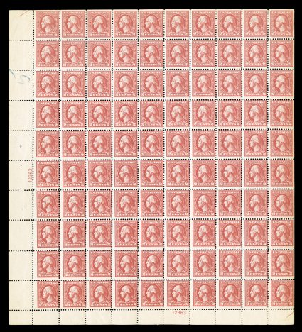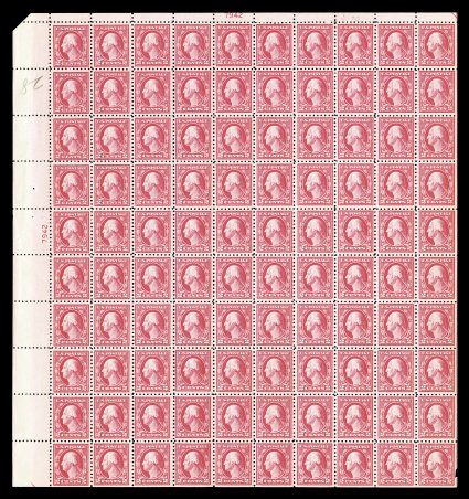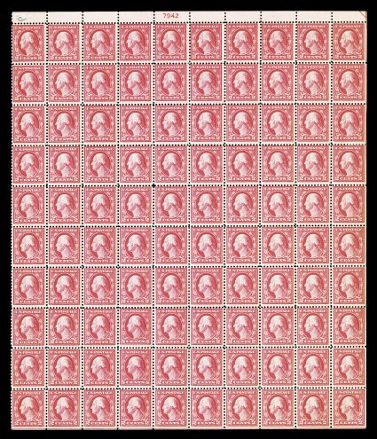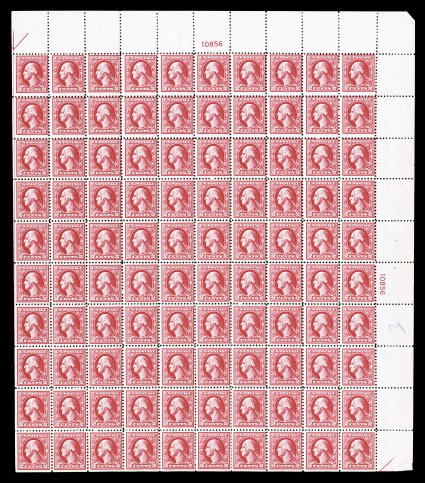 529 nhbl 526 image#526, 2c Carmine offset, Ty. IV, plate no. 10856 pane of 100, bright fresh color, o.g., n.h., blue crayon mark in the right selvage and a minor selvage crease at the bottom right, fine-very fine; a rarely offered mint sheet. (Image) $6,400.00