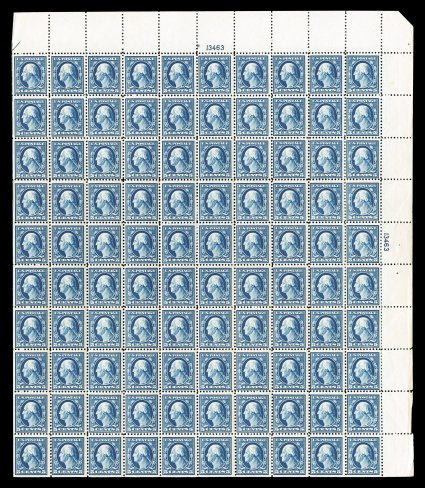 525 nhbl 504 image#504, 5c Blue, plate no. 13463 pane of 100, deep rich color on bright paper, o.g., n.h., some perf. separation mainly between the third and fourth rows, minor creasing in right selvage, fine-very fine; a very scarce sheet. (Image) $2,180.00