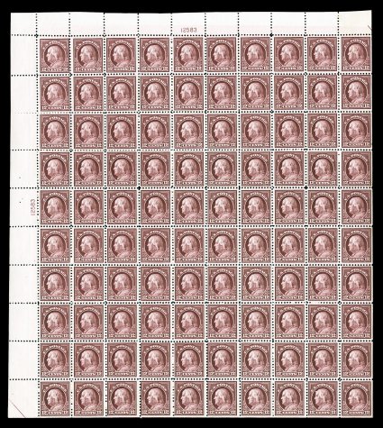 528 nhbl 512 image#512, 12c Claret brown, plate no. 12583 pane of 100, includes some very well centered stamps, rich color, o.g., n.h., some minor perf. separations, overall a very fine sheet. (Image) $2,220.00