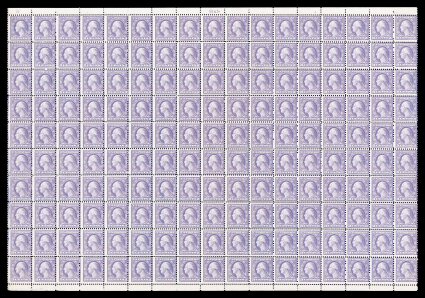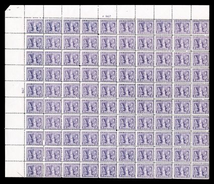 534 nhbl 541 image#541, 3c Violet coil waste, plate no. 9145 pane of 170, this being in the scarcer format with the plate number in the middle (although no premium was added in the catalog value), attractive color, o.g., n.h., a couple rows with minor perf. separation, fine; full panes of this coil waste stamp are almost never encountered. (Image) $15,770.00