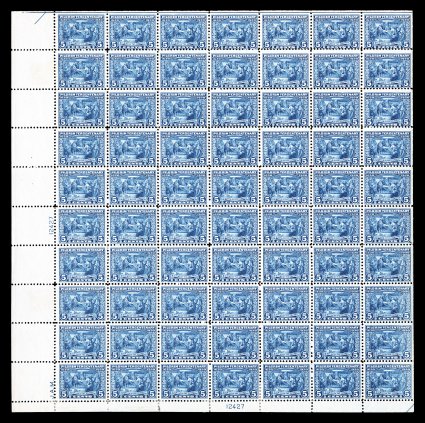 536 og/nhbl 548-50 image#548-50, 1c-5c Pilgrim Tercentenary cplt. in panes of 70, strong bright colors, o.g., one 1c stamp with small adherence on gum, 2c with small hinge reinforcement in the bottom selvage affecting the plate block, 5c with hinge reinforcements in the bottom row, otherwise the sheets are all n.h., 5c with two faint toned spots in left selvage not affecting the plate block, fine-very fine; complete sets of sheets of the Pilgrim Tercentenary are not easy to come by. (Image) $8,516.00