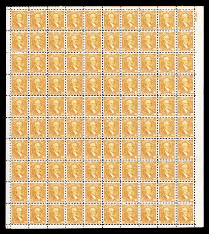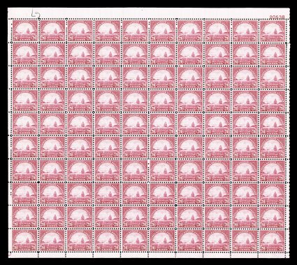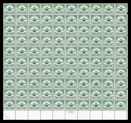 569 og/nhbl C4 image#C4, 8c Dark green, plate no. 14824 pane of 100, contains many extraordinarily well centered stamps, rich colors, o.g., n.h. except two stamp in the left margin hinged, light toning affects some stamp in the top row only, otherwise a very fine sheet. (Image) $4,074.00