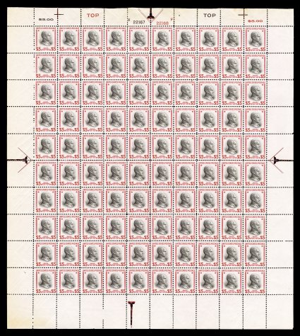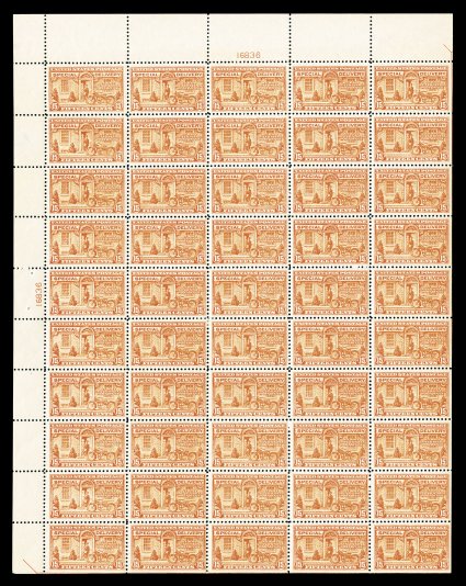 571 og/nhbl E13 image#E13, 15c Deep orange, plate no. 16836 pane of 50, bright color, o.g., all but six stamps n.h. (one plate block hinged), very fine sheet. (Image) $2,907.50