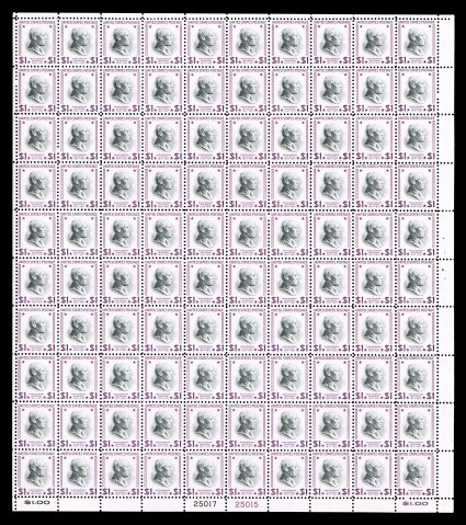 564 nhbl 832c image#832c, $1.00 Red violet and black, plate nos. 25017, 25015 pane of 100, exceedingly fresh, o.g., n.h., very fine. (Image) $606.00