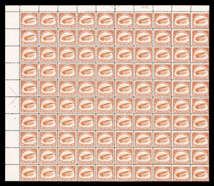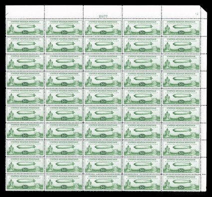 570 nhbl C18 image#C18, 50c Graf Zeppelin, plate no. 21177 pane of 50, particularly fresh, with bright color and clean white paper, o.g., n.h., fine-very fine; an attractive example of this very scarce and popular air post sheet. (Image) $5,150.00
