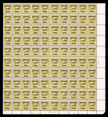573 ogbl K8a image#K8a, 16c on 8c Olive green, plate no. 10787 pane of 100, deep intense color, o.g., with most stamps being slightly disturbed by a glassine interleaving (everything cataloged as hinged), four stamps in the right column thinned, minor perf. separations, fine; a very rare Shanghai overprint sheet, in fact we would not be surprised if this was the only intact sheet of this stamp in existence today. (Image) $6,430.00
