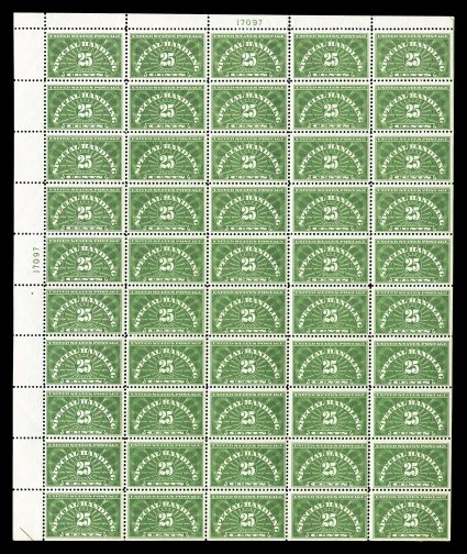 575 og/nhbl QE1-4 image#QE1-4, 10c-25c Special Handling cplt. in panes of 50, the 15c being the wet printing, bright and fresh throughout, o.g., n.h. except six 25c stamps l.h., 15c with natural gum crease affecting five stamps, 20c with some small natural gum skips, fine-very fine. (Image) $2,604.00