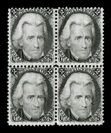 48 nhbl 73 image#73, 2c Black, fresh mint block of four, crisp detailed impression, o.g., never hinged, a couple light natural gum creases which are endemic to multiples of this stamp, bottom right stamp with natural paper inclusion, fine and scarce. (Image) for hinged $4,000.00
