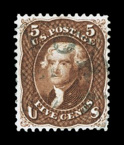 49 O 75 image#75, 5c Red brown, an eye-appealing used example, possessing striking color that is remarkably deep and luxuriant, especially vivid impression on brilliantly white paper, exceptionally well centered and margined for this always difficult stamp, light town cancel, extremely fine; 1985 and 2000 PF certificates. (Image) $525.00
