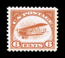 583 ogu C1 image#C1, 6c Orange, a superlative mint example that is perfectly centered within uncommonly large margins, brilliantly rich color on pristine white paper, o.g., very lightly hinged, superb; 2007 PSE certificate (Gem 100; SMQ $260.00 for 98); this is the sole copy of #C1 to receive the exalted Gem 100 designation, the highest grade to date. (Image) $60.00