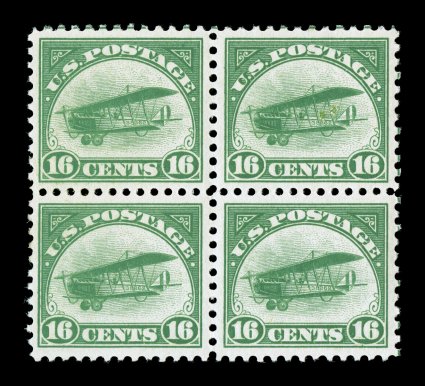 589 og/nhbl C2 image#C2, 16c Green, mint block of four, exceptionally well centered, deep luxuriant color, crisp and intact perforations, o.g., left pair l.h., right pair n.h., very fine-extremely fine; 2007 PF certificate. (Image) $440.00