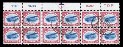 591 OPB C3 image#C3, 24c Carmine rose and blue, a most unusual used top margin arrow, two "TOP" and plate nos. 8493, 8492 block of twelve, brilliant fresh colors, nicely centered overall, Holton, Kans., double oval cancels, a few very minor wrinkles and a couple reinforced perfs. at bottom center, very fine; used plate blocks are not priced in Scott. (Image) Est. $300-400