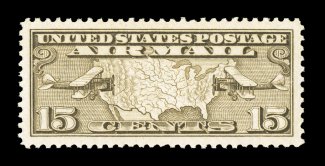 598 nhu C8 image#C8, 15c Map, a matchless quality mint single that is flawlessly centered within enormously large margins, sumptuously rich color and a deeply etched impression, o.g. n.h., simply superb; a striking gem; 2004 PSE certificate (Superb 98 Jumbo; SMQ $240.00 for 98); not only is this the highest graded #C8, it is the sole example to be given the Superb 98 Jumbo designation by the PSE. (Image) $5.25