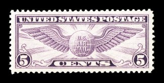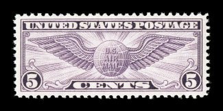 609 nhu C16 image#C16, 5c Winged Globe, excellent centering within particularly wide margin for this stamp, strong rich color, o.g., n.h., extremely fine; 2007 PSE certificate (XF-Superb 95 Jumbo; SMQ $240.00 for 95 and $600.00 for 98). (Image) $8.75