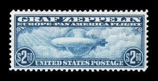 606 ogu C15 image#C15, $2.60 Graf Zeppelin, outstanding centering within extraordinarily large margins, rich color and a strong impression, o.g., lightly hinged, an extremely fine gem; a particularly handsome stamp; 2003 PSE certificate (Superb 98; SMQ $1,250.00). (Image) $775.00