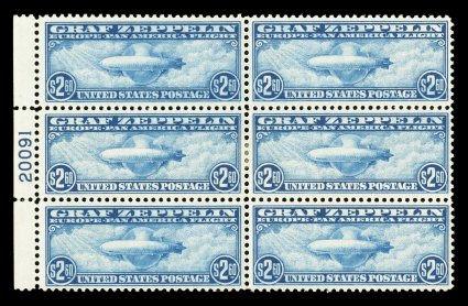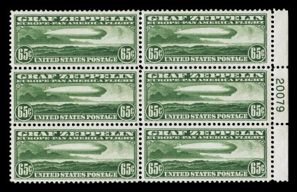 603 ogPB C13 image#C13, 65c Graf Zeppelin, right margin plat no. 20079 block of six, extraordinarily well centered, rich vibrant color, o.g., top and bottom stamps n.h., middle stamps with small h.r. and some black album offset on gum, otherwise extremely fine. (Image) $2,300.00