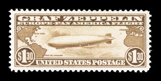 604 ogu C14 image#C14, $1.30 Graf Zeppelin, marvelously well centered within large margins, strong rich color and a crisp impression, o.g., very lightly hinged, extremely fine; an especially well centered and margined example; 2003 PSE certificate (XF-Superb 95; SMQ $690.00). (Image) $500.00