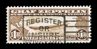 605 Ou C14 image#C14, $1.30 Graf Zeppelin, a choice used example, being wonderfully well centered within lavishly large margins, rich color, neat portion of machine slogan cancel, extremely fine; gem used examples of this stamp are especially difficult to come by; 2006 PSE certificate (XF-Superb 95; SMQ $850.00). (Image) $375.00