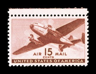 612 nhu C28 image#C28, 15c Brown carmine, top sheet-margin single, precisely centered within large margins, strong rich color, o.g., n.h., extremely fine gem; 2007 PSE certificate (Superb 98; SMQ $200.00); only one stamp grades higher (100). (Image) $2.25