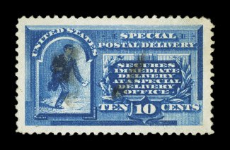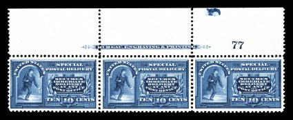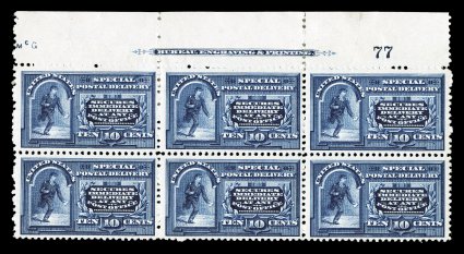 615 ogPB E4 image#E4, 10c Blue, top margin imprint and plate no. 77 block of six, strong rich color, well centered for a plate block, o.g. (small disturbance on top left stamp), right two stamps with a vertical crease, some hinge reinforcing mainly in the top margin, small selvage thin, very fine appearance; a most presentable example of this rare special delivery plate block. (Image) $17,500.00