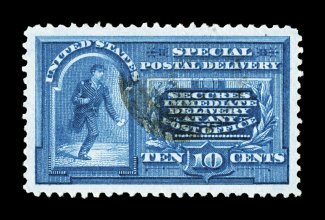 614 Ou E1 image#E1, 10c Blue, a spectacular used example that possesses the largest margins we have ever seen on this stamp, and quite remarkably, it is impeccably well centered within these vast borders, rich luxuriant color and a crisp impression, light unobtrusive cancel, an extremely fine used gem; 1999 PF certificate and a 2007 PSE certificate (XF-Superb 95 Jumbo; SMQ $335.00 for 95 and $720.00 for 98). (Image) $70.00