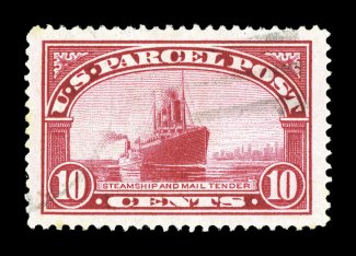 662 Ou Q6 image#Q6, 10c Parcel Post, a stunning used example, possessing margins of truly enormous size, and being incredibly well centered within them, deep vibrant color and impression, very lightly cancelled which is quite uncharacteristic of the parcel post stamps, a superb jumbo; 2003 PSE certificate (Superb 98 Jumbo; SMQ $215.00 for 98); this is the only #Q6 (mint or used) to receive the impressive 98J designation, the highest given to date for this stamp. (Image) $3.50