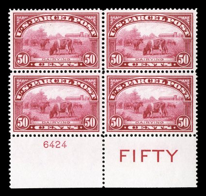 667 ogPB Q10 image#Q10, 50c Parcel Post, full bottom margin imprint and plate no. 6424 block of four, wonderfully well centered, especially the bottom stamps, radiant color on fresh paper, o.g., lightly hinged (bottom stamps n.h.), extremely fine; a choice quality plate block. (Image) $2,000.00