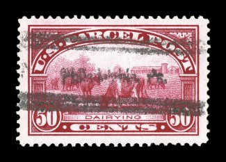 668 Ou Q10 image#Q10, 50c Parcel Post, a remarkable used example, featuring huge margins all around and being marvelously well centered within these vast borders, radiant color and a detailed impression on fresh paper, extremely fine jumbo; 2004 PSE certificate (Superb 98 Jumbo; SMQ $590.00 for 98); the highest graded used #Q10, and the only example to be graded 98J. (Image) $50.00