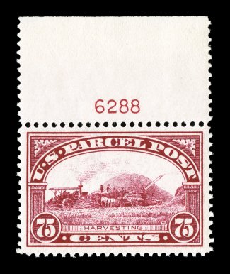 670 nh Q11 image#Q11, 75c Parcel Post, top margin plate no. 6288 single, exceptionally well centered within uncharacteristically large margins, strong color and impressions, o.g., n.h., extremely fine. (Image) $240.00
