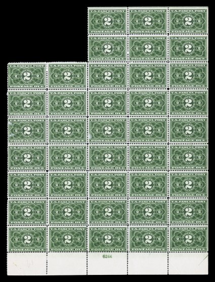 675 ogbl JQ2 image#JQ2, 2c Parcel Post Postage Due, bottom margin plate no. 6244 block of 41, being nearly a full pane that is only missing a block of four from the top left, strong rich color, o.g. that has a slight overall disturbance from interleaving, a few perf. separations, two stamps in the fifth row with small adherence on face, fine-very fine. (Image) $6,900.00