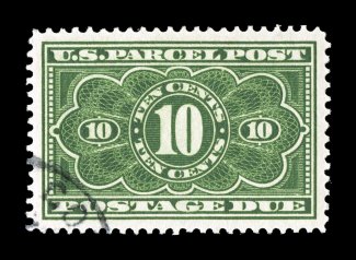 676 Ou JQ4 image#JQ4, 10c Parcel Post Postage Due, a phenomenal used example that ranks as one of the finest used Ten Cent Parcel Postage Dues in existence, as it features impressive characteristics that are almost never found on this exceedingly difficult stamp, including being precisely centered within extraordinarily large and perfectly balanced margins all around, rich luxuriant color and a well incised impression, even its cancel is exceptional, being confined to the bottom left corner, a superb gem in every regard; 2004 PSE certificate (Superb 98; SMQ $590.00); the highest grade the PSE has assigned to any Parcel Postage Due stamp. (Image) $45.00