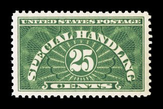 677 nhu QE4 image#QE4, 25c Special Handling, flawlessly centered amid large margins, rich luxuriant color and a crisp detailed impression, o.g., n.h., extremely fine gem; 2007 PSE certificate (Superb 98; SMQ $385.00). (Image) $32.50