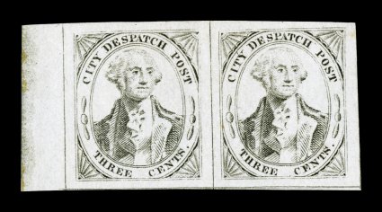 678 og 40L1 image#40L1, City Despatch Post 3c Black on grayish, left sheet-margin horizontal pair, with the other three margins also being quite large, exceptionally fresh, full o.g., lightly hinged, extremely fine; a scarce multiple, especially in this gem quality; 1993 PF certificate. (Image) $850.00