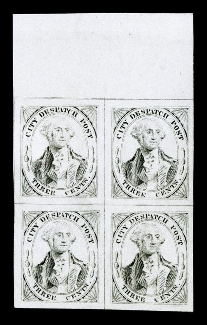 679 ogbl 40L1 image#40L1, City Despatch Post 3c Black on grayish, attractive top sheet-margin block of four, position 4-5/10-11, large balanced margins on the other three sides as well that show nearly full dividing lines at left, fresh with nice impression on bright paper, full o.g., lightly hinged, an extremely fine gem block; 1956 PF certificate. (Image) $1,900.00