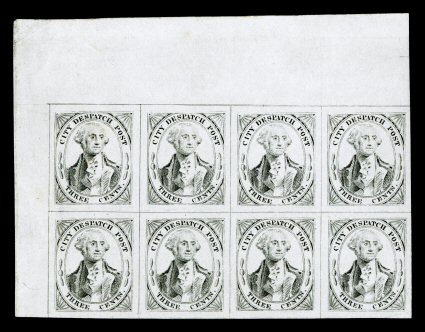 680 ogbl 40L1 image#40L1, City Despatch Post 3c Black on grayish, a spectacular top left corner sheet-margin block of eight (4x2), positions 1-4/7-10, fabulously fresh, prooflike color and impressions on bright paper, huge margins all around, including immense sheet margins at top and left and virtually full dividing line at bottom, full clean o.g., minor corner crease in the extreme top left selvage and natural pinpoint thin speck in one stamp, extremely fine; an impressive gem multiple of the first adhesive postage stamp ever issued in the United States; 1970 PF certificate. (Image) $3,800.00