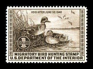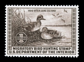 701 nhu RW6 image#RW6, 1939 $1.00 Chocolate, extraordinarily well centered within uncommonly large margins, deeply rich color and a sharp impression, o.g., n.h., extremely fine and quite choice; 2006 PSE certificate (XF-Superb 95; SMQ $1,100.00). (Image) $275.00