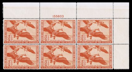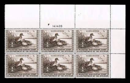 703 nhPB RW6 image#RW6, 1939 $1.00 Chocolate, full top right margin plate no. F141428 block of six, with extra-large selvage at top, exceptionally well centered, strong rich color, o.g., n.h., some gum skips as is often the case, extremely fine. (Image) $2,500.00