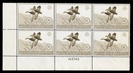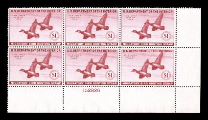 711 nhPB RW10 image#RW10, 1943 $1.00 Deep rose, full bottom right margin plate no. 152826 block of six, exceptionally well centered, brilliant color, o.g., n.h., extremely fine. (Image) $650.00