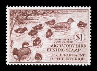 709 nhu RW9 image#RW9, 1942 $1.00 Violet brown, nicely centered and margined, rich color, o.g., n.h., choice very fine; 2006 PSE certificate (VF-XF 85; SMQ $280.00). (Image) $250.00