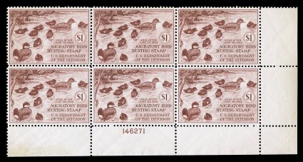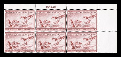 717 nhPB RW13 image#RW13, 1946 $1.00 Red brown, top right margin plate no. 158448 block of six, amazingly well centered, strong rich color, o.g., n.h., extremely fine. (Image) $300.00