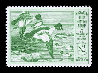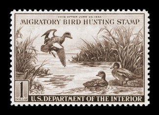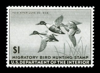 714 nhu RW12 image#RW12, 1945 $1.00 Black, uncommonly well centered within extravagantly large margins, wonderfully fresh, o.g., n.h., extremely fine; 2006 PSE certificate (XF 90 Jumbo; SMQ $210.00 for 90 and $600.00 for 95). (Image) $100.00