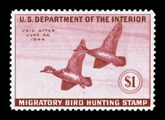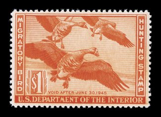 712 nhu RW11 image#RW11, 1944 $1.00 Red orange, exceptionally well centered within wide margins, deep vibrant color, o.g., n.h., extremely fine; 2004 PSE certificate (XF-Superb 95; SMQ $550.00). (Image) $110.00