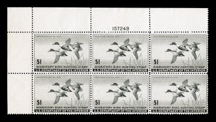 715 nhPB RW12 image#RW12, 1945 $1.00 Black, handsome full top left margin plate no. 157249 block of six, especially well centered, strong color, o.g., n.h., extremely fine. (Image) $450.00