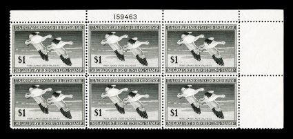 718 nhPB RW14 image#RW14, 1947 $1.00 Black, top right margin plate no. 159463 block of six, outstanding centering, wonderfully fresh, o.g., n.h., extremely fine. (Image) $350.00