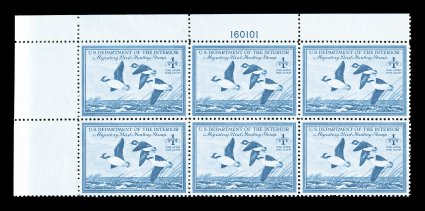 719 nhPB RW15 image#RW15, 1948 $1.00 Bright blue, top left margin plate no. 160101 block of six, beautifully centered, rich vibrant color, pristine o.g., n.h., extremely fine. (Image) $400.00