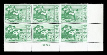 720 nhPB RW16 image#RW16, 1949 $2.00 Bright green, full bottom right margin plate no. 160792 block of six, excellent centering, bright color, o.g., n.h., extremely fine. (Image) $450.00