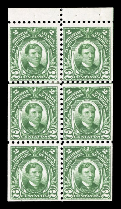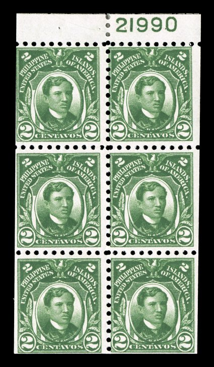 762 ogBP 276a image#276a, 2c Green, booklet pane of six, with plate no. 21990 in selvage tab, deep intense color, o.g., small h.r. in selvage, stamps n.h., fine; this booklet pane is rarely seen with a plate number. (Image) $750.00+