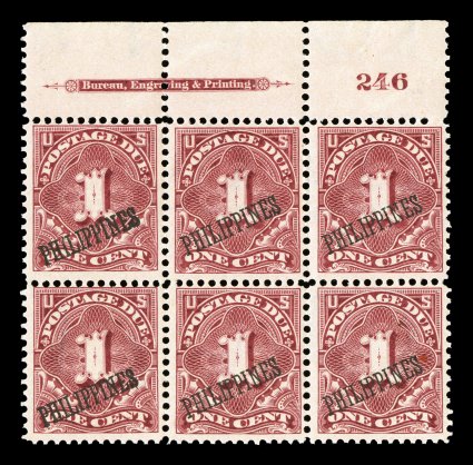 763 ogPB J1 image#J1, 1c Deep claret, full top margin imprint and plate no. 246 block of six, strong color, o.g., faintly hinged in the selvage, stamps n.h., fine-very fine. (Image) $650.00