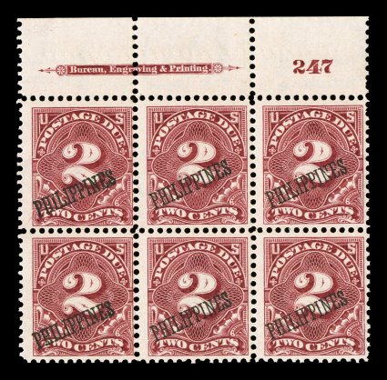 764 ogPB J2 image#J2, 2c Deep claret, full top margin imprint and plate no. 247 block of six, deep rich color, o.g. that has been just slightly disturbed from interleaving, fine. (Image) $650.00