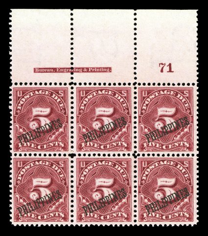 765 ogPB J3 image#J3, 5c Deep claret, full top margin imprint and plate no. 71 block of six, with large sheet selvage, deep intense color, nicely centered, disturbed o.g. from interleaving, very fine; a most elusive plate block. (Image) $1,500.00